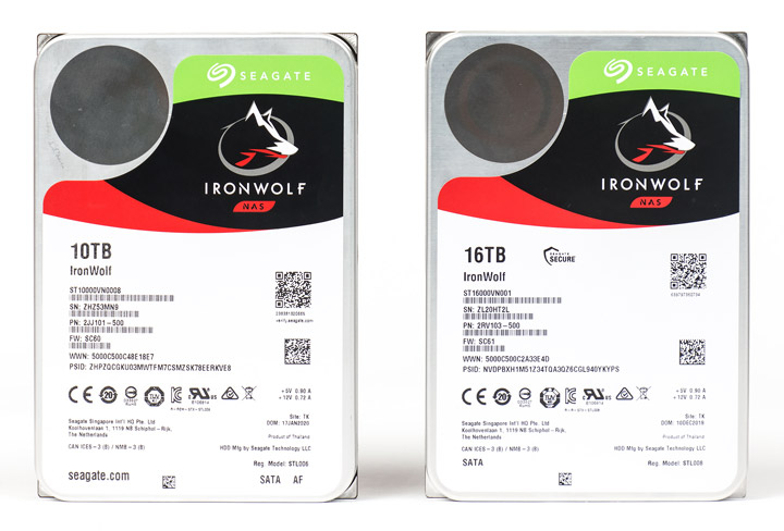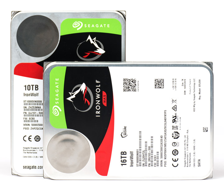 В качестве испытуемых будут взяты два объемных накопителя Seagate IronWolf — ST10000VN0008 на 10 Tбайт и ST16000VN001 на 16 Tбайт. Эти жесткие диски специально заточены для использования в NAS-хранилищах.