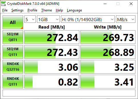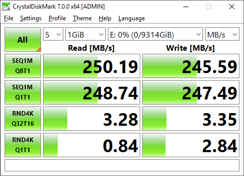 Начнем с CrystalDiskMark, типичные настройки по умолчанию.