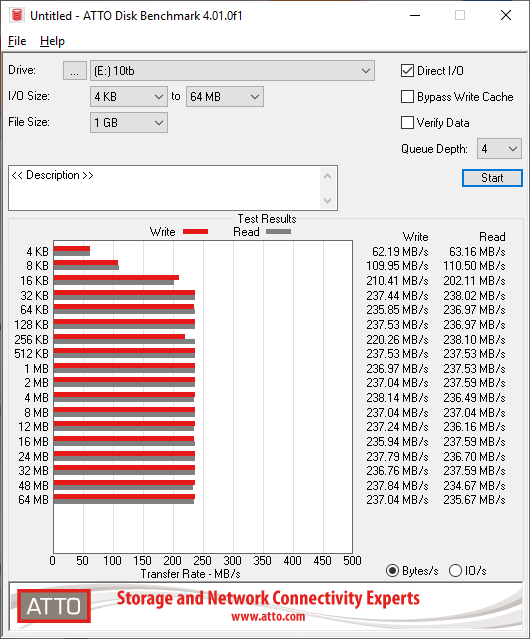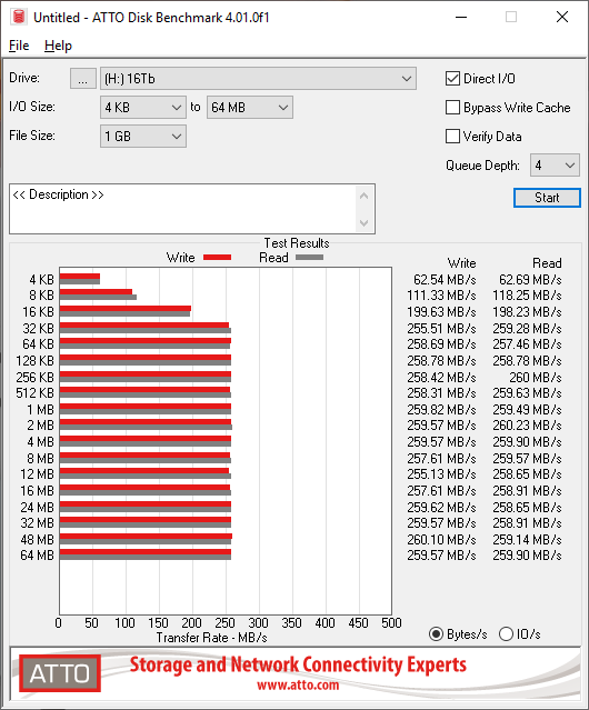 В ATTO Disk Benchmark просадки начинаются на блоках 16 КБ и ниже. Большие блоки удерживают +/– одинаковую скорость.