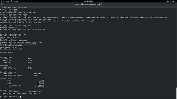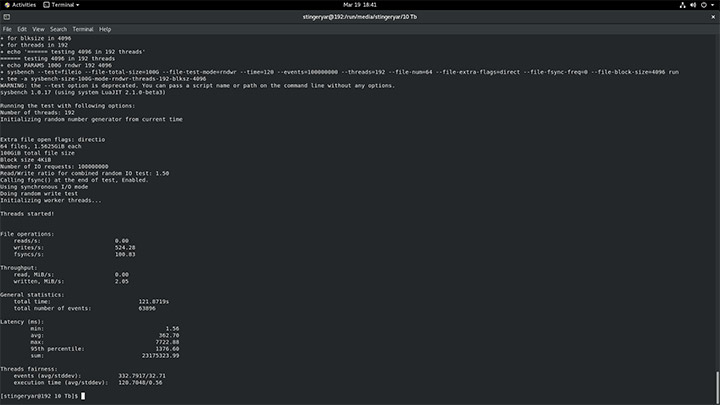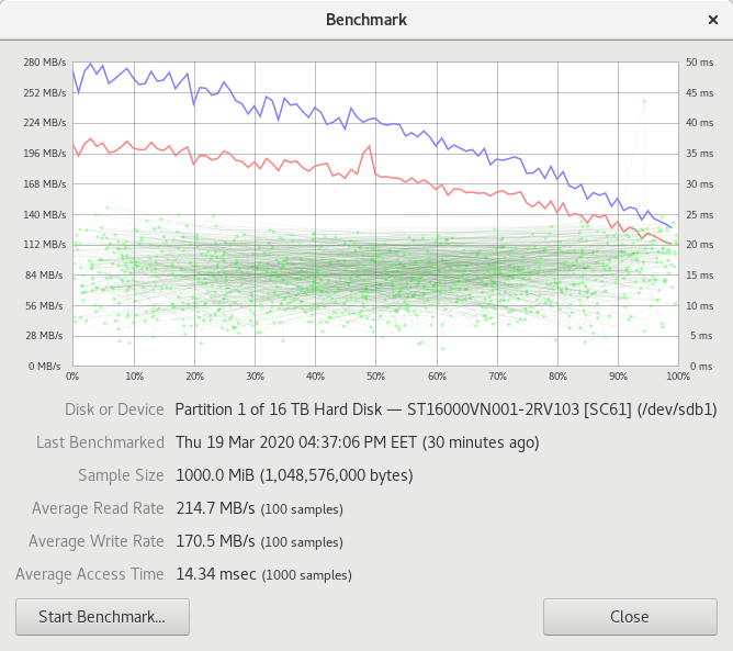 Встроенный бенчмарк показывает схожие показатели с тестами в Windows. Кроме того, прекрасно видно поведение в начальной и конечной области жесткого диска. А теперь представим, что испытуемые отправились в датацентр, и получили серьезную нагрузку.