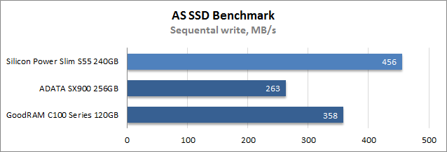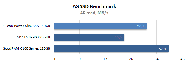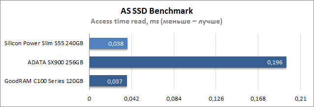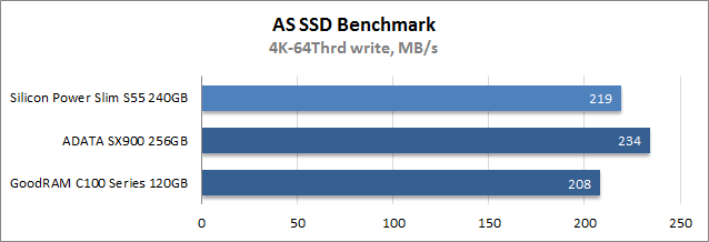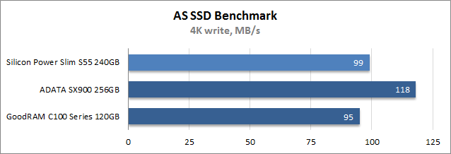 При выполнении операций последовательной записи и по части времени доступа Silicon Power Slim S55 240GB показал наилучшие результаты, за ним с заметным отставанием расположился накопитель GoodRAM, а самым медленным оказался SSD ADATA. Во время случайной записи блоков размером 4К ситуация прямо противоположная: лучше других выступил ADATA SX900 256GB, тогда как оба накопителя на базе Phison PS3108-S8 демонстрируют примерно равные результаты, что вызвано, скорее всего, конструктивными особенностями платформы, не лучшим образом оптимизированной для записи мелких файлов.