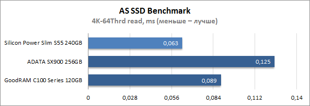 В подтесте последовательного чтения оба накопителя на контроллере Phison показали одинаковые результаты, тогда как ADATA SX900 256GB немного отстал от своих соперников. При случайном чтении блоков размером 4К новичок занял второе место, уступив только GoodRAM C100 Series 120GB, тогда как SSD на платформе SandForce второго поколения продемонстрировал на 25% меньшую скорость работы. При формировании очереди глубиной в 64 запроса файла 4К в лидерах оказался накопитель на базе контроллера SF-2281, чуть худшие результаты у SSD GoodRAM, а Silicon Power Slim S55 240GB занял последнее место, но зато показал наименьшее время доступа при чтении. Очевидно, разница в результатах двух SSD, основанных на эталонном дизайне Phison, объясняется отличными версиями прошивки.