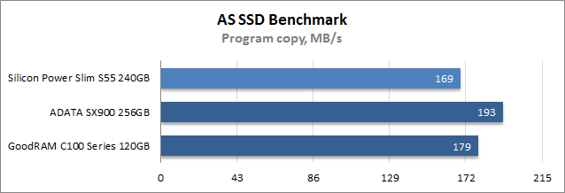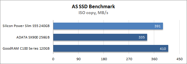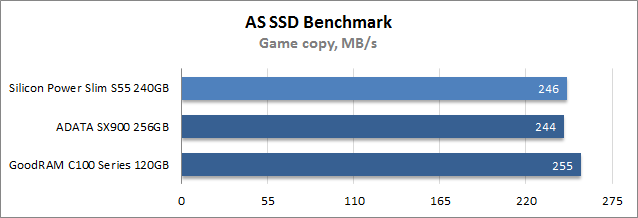При выполнении тестовой трассы ISO, которая эмулирует перенос папки с образами оптических дисков, лучшие результаты показал GoodRAM C100 Series 120GB, а второе место с минимальным отставанием занял Silicon Power Slim S55 240GB, тогда как самую низкую скорость работы продемонстрировало запоминающее устройства ADATA. В подтесте копирования папки с установленными играми все три участника показали близкое быстродействие, а при перемещении директории с программами победил твердотельный накопитель на платформе SandForce, который даже в состоянии устоявшейся производительности демонстрирует отличную скорость записи мелких файлов.
