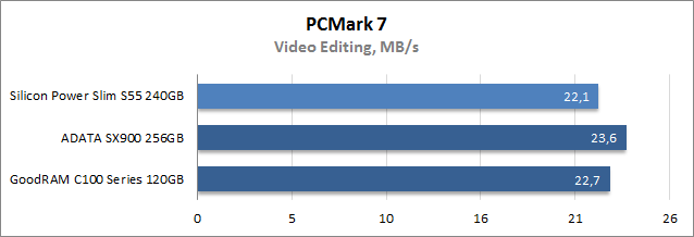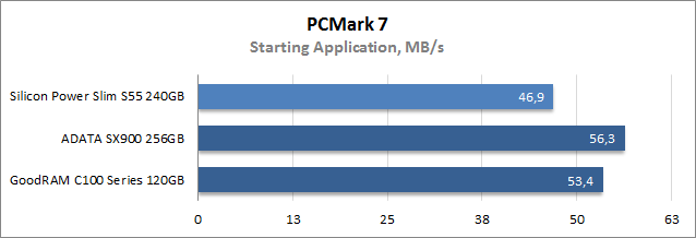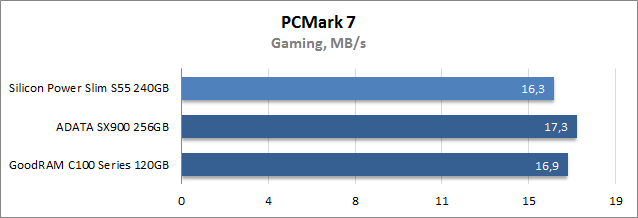 Общий балл в подтесте Storage из комплексного тестового пакета PCMark 7 позволяет сравнить скорость работы накопителей при выполнении типичных повседневных задач. Здесь мы видим, что новичок продемонстрировал самые скромные показатели быстродействия.