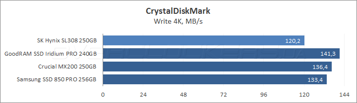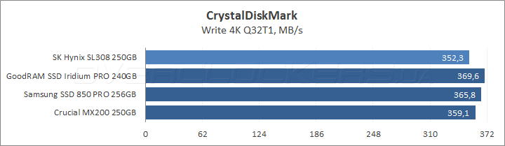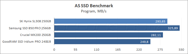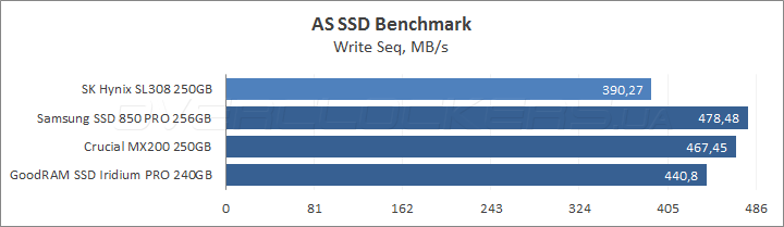 На момент тестирования SK hynix Canvas SL308 250GB в нашей лаборатории были доступны три накопителя объемом 240-256 Гбайт: Samsung SSD 850 Pro, Crucial MX200, GOODRAM SSD Iridium Pro. Стоит понимать, что все три конкурентных решения относятся к значительно более дорогому ценовому сегменту (разница в цене с Samsung SSD 850 Pro 240GB достигает двукратной отметки) и при разборе результатов будет анализироваться не чистая скорость, а соотношение цены и производительности.