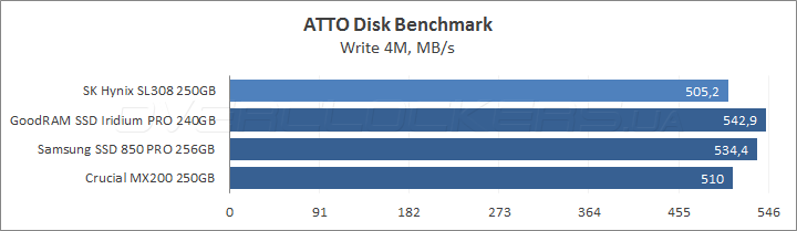 В ATTO Disk Benchmark максимальная дельта результатов сократилась до 7%. Пиковые показатели скорости записи составили 505,2 Мбайт/с, что на 15 Мбайт/с выше, чем указал производитель в технических характеристиках устройства. При считывании информации в очередной раз сохранился паритет с Samsung SSD 850 Pro 240GB.
