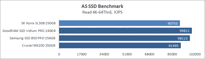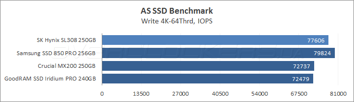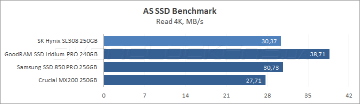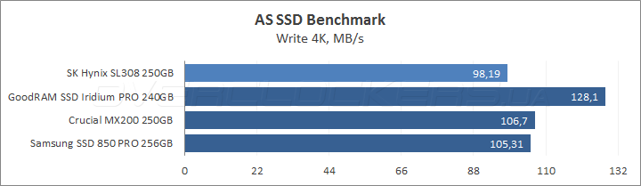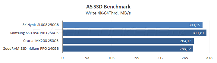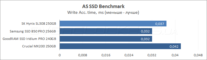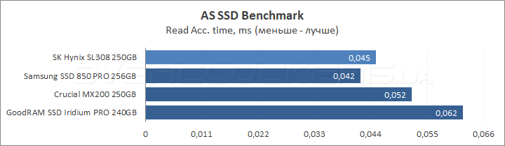 В синтетическом тесте AS SSD Benchmark лидер зависит от типа используемых данных. Наиболее боеспособным SK hynix Canvas SL308 250GB оказался в подтесте чтения/записи блоков 4К с глубиной очереди равной 64. Также, можно отметить невысокое время отклика в 0,037–0,045 мс.