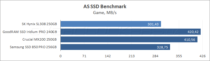 Имитация нагрузки реальных приложений зафиксировала скорость работы накопителя на уровне от 301,43 Мбайт/с до 401,69 Мбайт/с. Примечательно, что и SK hynix Canvas SL308 250GB, и Samsung SSD 850 Pro 240GB, заметно отстали от оппонентов в подтесте Game.