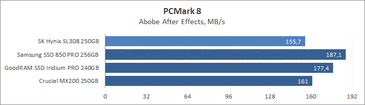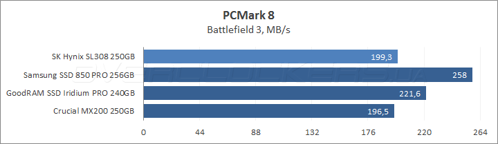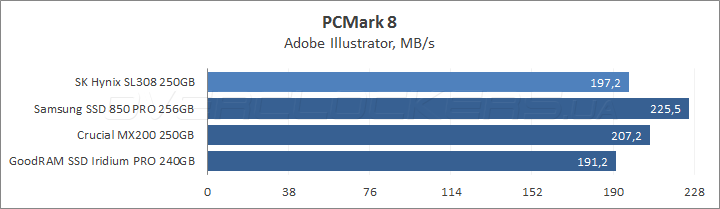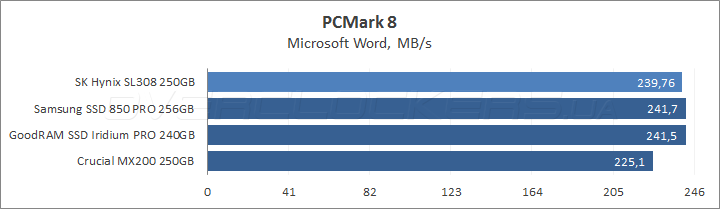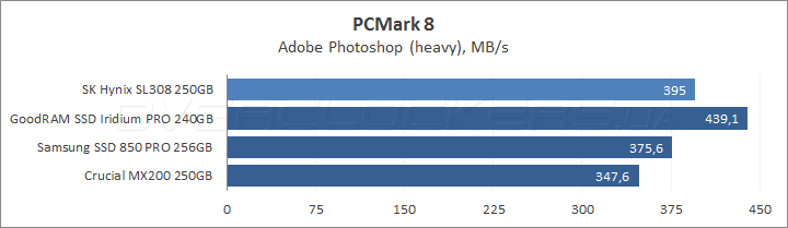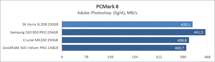 В разрезе приложений видно, что SK hynix Canvas SL308 250GB активно соперничает с вышеупомянутым GOODRAM SSD Iridium Pro 240GB, попутно навязывая борьбу Crucial MX200 250GB в ряде программ: Battlefield 3, Adobe Photoshop и Microsoft Word. На максимальную отдачу от накопителя пользователь может рассчитывать при обработке фотографий в среде Adobe Photoshop.