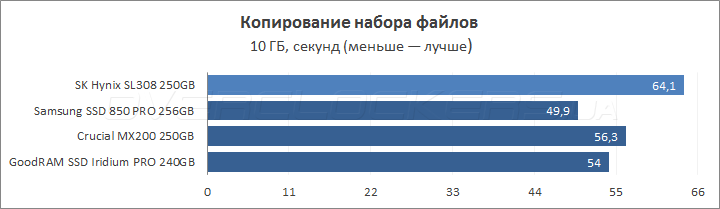 Суммарный объем данных в 10 Гбайт удалось скопировать за чуть более чем 64 секунды. Результат далеко не выдающийся. Тест был повторен несколько раз, чтобы убедиться в отсутствии ошибки. Похоже, инженерам и программистам SK hynix еще предстоит проделать определённую работу по оптимизации алгоритмов работы микрочипа в этом направлении. Потенциал у них продукта определенно есть.