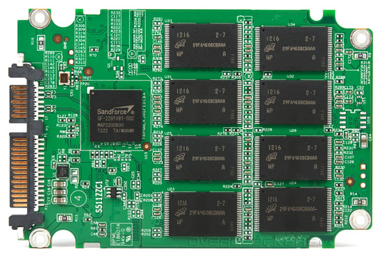 Обратная сторона платы несет еще восемь чипов флеш-памяти с маркировкой 29F64G08CBAAA, производства фабрики IMFT. Микросхемы изготовлены на 16 неделе 2012 года с соблюдением 25-нм технологического процесса и имеют емкость 8 Гбайт. Таким образом, к каждому из восьми каналов контроллера SF-2281 подключены два чипа, что обеспечивает двукратное чередование, а суммарный объем накопителя составляет 128 Гбайт.