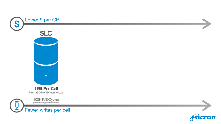 Первыми на рынок попали транзисторные накопители, в которых одна ячейка умела хранить один бит информации путем определения всего двух уровней заряда — заряжено-разряжено, грубо говоря. За технологией закрепилось рыночное название SLC (Single level cell) — одноуровневая ячейка (здесь и далее мы используем элементы инфографики Micron).