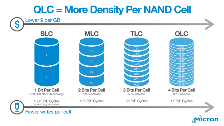 Потребитель только отошел от удивления падению ресурса в TLC, как ему предлагают уже 4-х ячеечную QLC. Приведу известную картинку.