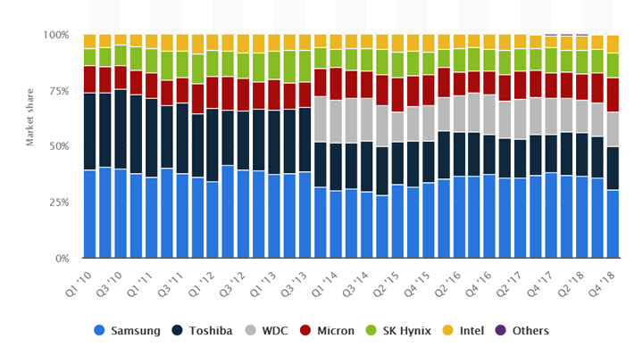 Не совсем так. Выше мы прочитали про видение этого вопроса в плоскости стандартов. И с этих позиций толку в марафонах немного. Но используемые технологии постоянно усложняются, а техпроцессы утончаются. Вводятся новые подходы во внутренней логике работы контроллеров, типа многократных попыток чтения с разными электрическими характеристиками — авось при каком-то напряжении ошибок не будет. На этом фоне протиратели достигли одного неочевидного на первый взгляд, но подтвержденного статистически достоверно, вывода — при постоянном хорошем питании твердотельные накопители уверенно превосходят паспортные показатели. Но какой от этого толк? Его мы, скорее всего, увидим уже в будущих сериях SSD. Возможно даже в каких-то реализациях QLC-технологий или позже, т.к. количество доступных перепрограммирований ячеек с последующим уверенным чтением, как мы видим, неуклонно падает по конкретно-физическим причинам. Это, скорее всего, будет снабжение накопителей оффлайн-питанием, т.е. аккумуляторами, чтобы хотя бы между включениями рабочей станции такой накопитель не голодал. Но это только предположение. Правда, основанное на статистике. Но так уже и до i-ram недалеко — там что-то похожее уже было. Но все это потом, а в данный момент рынок флэш-памяти NAND, на которой и построены твердотельные напотели, выглядит вот так, т.е. почти олигопольно, что не может не намекать на перспективы динамики цен на востребованный продукт.