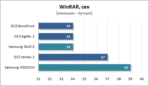 Теперь WinRar. За основу брался архив размером 62 869 928 байт (59,9 Мбайт) включавший в себя 62246 файлов и 3796 папок. Размер файлов был самый разномастный — от нескольких байт до нескольких мегабайт. Он копировался на раздел тестируемого диска и после перезагрузки разархивировался. Время, затраченное на процедуру, фиксировалось. Результаты: