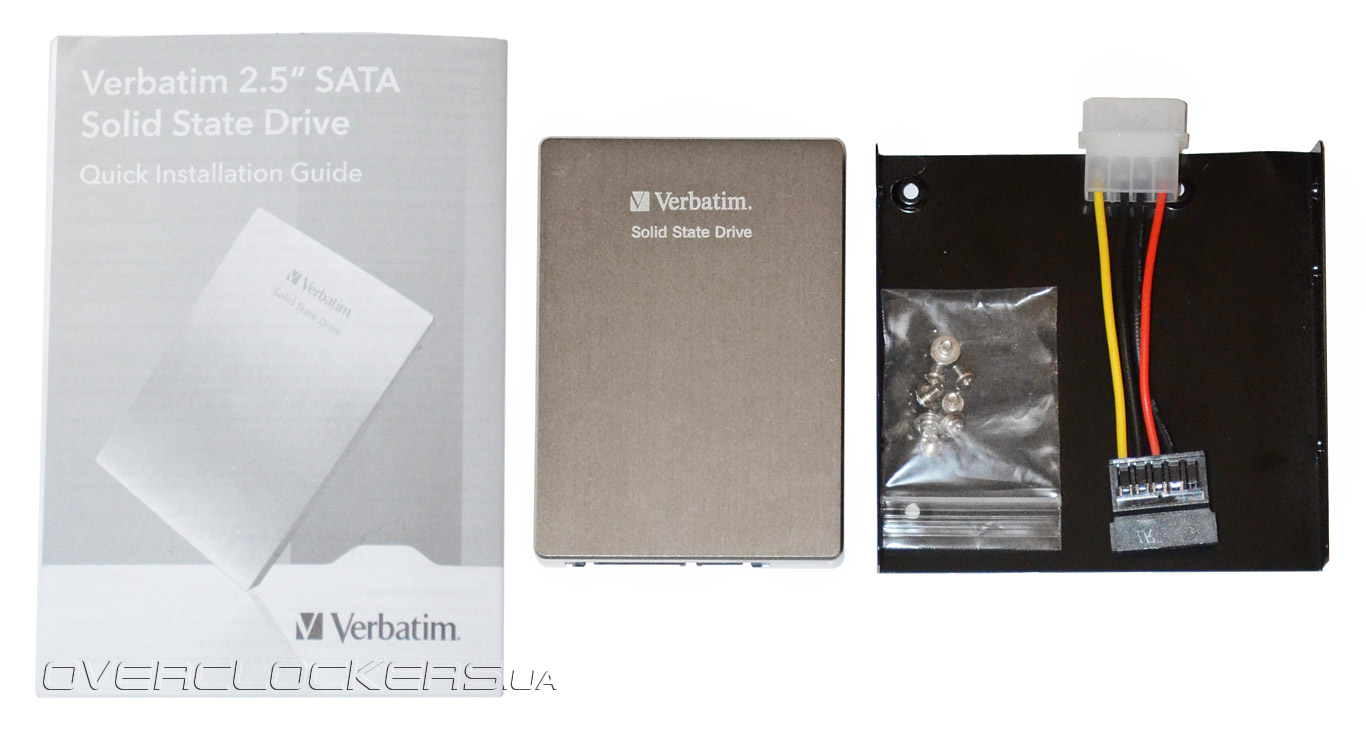 В комплекте есть инструкция, переходник питания с обычного четырехконтактного разъема и переходник для установки накопителя в 3,5” отсек.