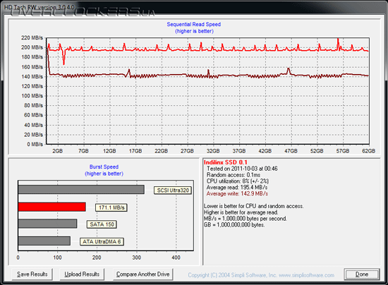 Первым делом была произведена оценка «чистого» быстродействия накопителя, выражающегося в его линейных скоростях и латентности. Как видно на графике HDTach, чтение проходит со скоростью 195,4 Мбайт/с, а запись — на 140 Мбайт/с. Конечно, это значительно меньше, чем у современных топовых моделей на базе контроллеров Sandforce и Marvell, однако и ценовая категория совсем другая. В любом случае, по сравнению с абсолютно любым традиционным жестким диском эти показатели значительно выше. Регулярная «гребенка», видная на графике, объясняется периодической активацией алгоритмов garbage collection и wear leveling, в фоновом режиме очищающих неиспользуемые ячейки и балансирующих износ чипов, соответственно. Именно они занизили и показатель средней скорости чтения до 195,4 Мбайт/с — максимальный составляет 214 Мбайт/с.