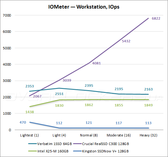 В IOMeter Workstation результаты Verbatim 1SSD 64 Гбайт оказываются неожиданно высокими: с таким характером нагрузки он оказался способен обработать более 2000 запросов в секунду (чего на практике не случается никогда), что говорит о большом запасе производительности контроллера и отличной прошивке. Максимальные результаты достигаются на глубине очереди запросов 2 и 4 (2561 и 2551 IOps), однако и с ростом нагрузки быстродействие снижается несильно — на максимальной сложности (QD=32) он обеспечивает более чем достаточные 2162 IOps.