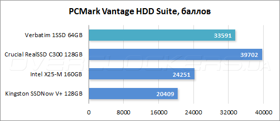 В пакете тестов PCMark Vantage HDD Suite накопитель SSD Verbatim получил оценку 33591 балл. Это один из лучших результатов среди твердотельных накопителей, основанных не на контроллерах Sandforce или Marvell 9174, которые, как мы уже упоминали, относятся к более высокому классу. Для сравнения, самый быстрый из представленных сегодня на рынке жестких дисков с частотой вращения шпинделя 7200 об/мин — WD2002FAEX — набирает в этом тесте только 6864 балла — почти в пять раз меньше!