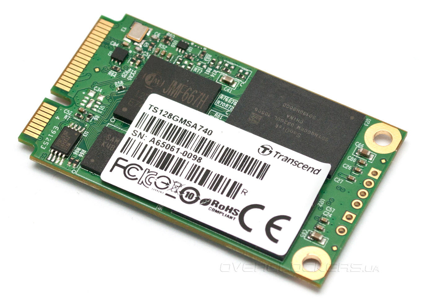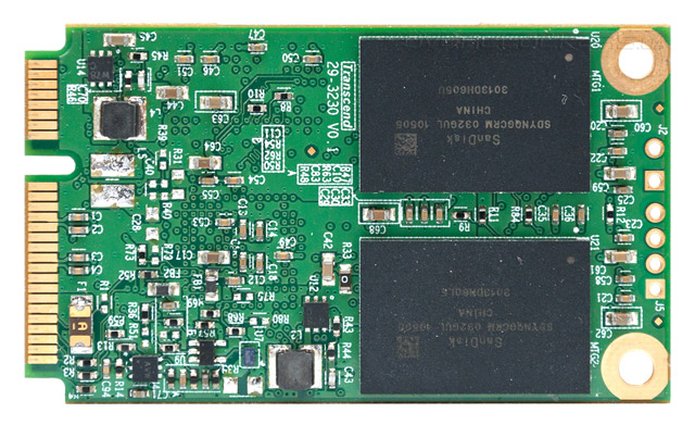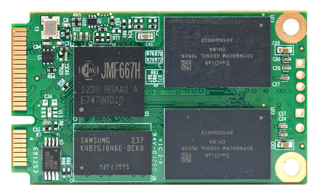 Как уже было сказано, накопитель Transcend TS128GMSA740 выполнен в форм-факторе MO-300A и предназначен для установки в разъем mSATA. Печатная плата имеет габариты 50,8 х 29,85 мм, высота не превышает 4 мм, а масса составляет всего 8 г. Несмотря на компактные размеры, новичок не отличается особой экономичностью: при выполнении операций записи энергопотребление может достигать 2,12 Вт, а при чтении данных и в простое SSD потребляет 1,4 Вт и 0,33 Вт соответственно. Твердотельные накопители Transcend MSA740 основаны на управляющем микрочипе JMF667H производства JMicron. Этот контроллер базируется на 32-битной архитектуре ARM, поддерживает интерфейс SATA 6 Гбит/с и располагает четырьмя каналами для подключения флэш-памяти NAND с интерфейсами ONFi и Toggle Mode. Есть поддержка команды TRIM, а для повышения надежности хранения данных применяется внутреннее циклическое кодирование ВСН и технология выравнивания износа. А вот официальных данных о поддержке JMF667H аппаратного шифрования или компрессии данных нет. Для кэширования данных и хранения таблицы трансляции адресов служит микросхема DRAM DDR3 объемом 256 МБ производства Samsung.