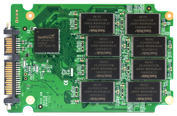 Внутри пластикового корпуса находится печатная плата с микросхемами памяти, управляющим чипом и набором вспомогательных электронных компонентов. В качестве контроллера используется проверенный временем SandForce SF-2281 от компании LSI. К преимуществам данного решения следует отнести совместимость с интерфейсом SATA 6 Гбит/с, неплохую производительность и поддержку аппаратного шифрования AES-128. Недостатки также известны: невысокая эффективность механизмов фоновой «уборки мусора» и несовершенная реализация команды TRIM.
