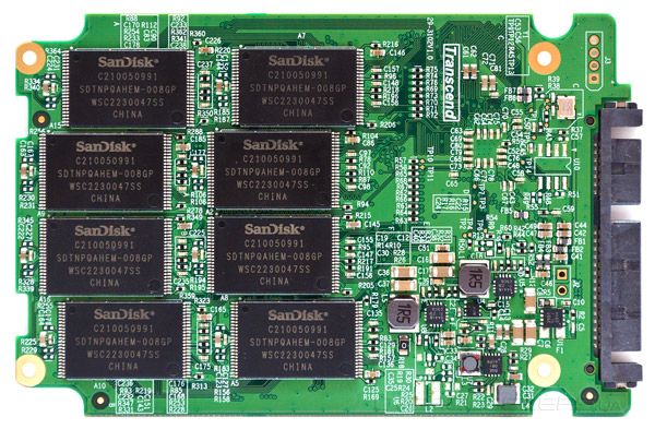 С обеих сторон печатной платы установлены 16 микросхем MLC NAND, на которые нанесена маркировка SDTNPQAHEM-008G. Запоминающие устройства, изготовленные с соблюдением 24-нм норм технологического процесса, производятся на совместном предприятии SanDisk и Toshiba. Чипы имеют емкость по 8 ГБ, так что на каждый из восьми каналов контроллера SF-2281 приходится по две микросхемы. Заметим, что флэш-память работает в режиме Toggle mode, так что мы вправе ожидать от в Transcend SSD720 128GB хорошего быстродействия.