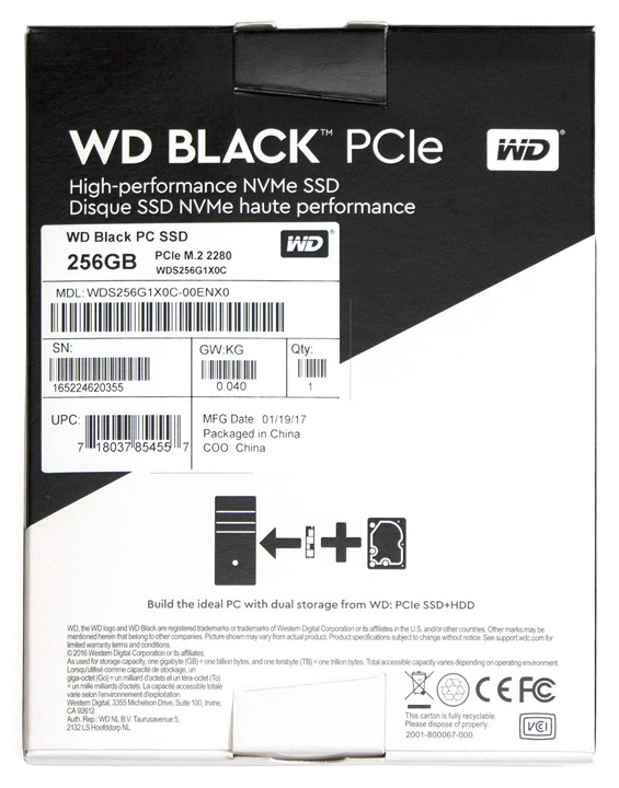Накопитель поставляется в картонной коробке средних размеров. На развороте содержится информация о точном названии модели, объеме доступного пространства, серийном номере, дате и стране производства. Через незамысловатую схему Western Digital не забывает напомнить и о том, что для создания «идеального» ПК оптимально использовать комбинацию из быстрого SSD и надежного HDD, который точно также можно подобрать из широкого ассортимента устройств американского бренда.