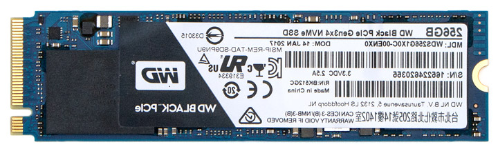 На бумаге набор характеристик WD Black PCIe SSD выглядит весьма привлекательно. Перед нами SSD с изначальной поддержкой перспективного протокола NVMe и интерфейсом подключения PCI-E 3.0 x4, скорость передачи данных которого достигает отметки в 2050 Мбайт/с для чтения и 800 Мбайт/с для записи. Ценовая политика, как для такого класса устройств, приятно радует и базовую версию на 256 Гбайт в Соединенных Штатах можно приобрести уже за 109 долларов. Несколько настораживает тот факт, что в качестве флэш-памяти использованы схемы типа TLC NAND, а значит, мы имеем дело с «псевдо-SLC» буфером, но обо всем по порядку.