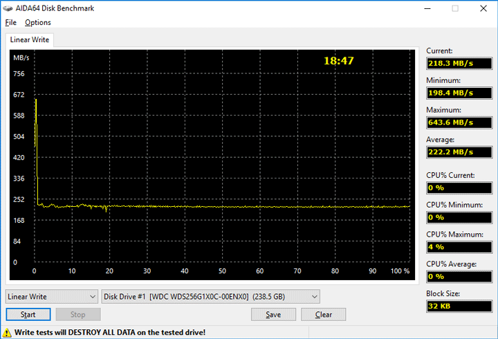 Как упоминалось выше, использование TLC NAND памяти означает наличие «псевдо-SLC» буфера, объем которого у WD Black PCIe SSD 256GB составляет чуть более трех гигабайт. Это немного по современным меркам и на рынке можно встретить достаточное количество моделей с более ёмким буфером. После его заполнения, скорость записи падает с максимальных 700 Мбайт/с до заметно более скромных 220 Мбайт/с.