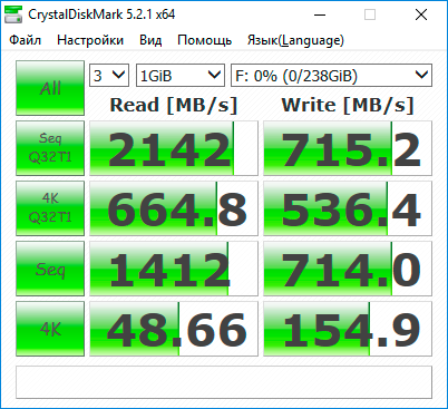 В классических синтетических бенчмарках WD Black PCIe SSD 256GB демонстрирует высокие результаты, которые соответствуют, а где-то даже превосходят, заявленные базовые характеристики. Максимальная линейная скорость, зафиксированная утилитой CrystalDiskMark, составила 2142 Мбайт/с для чтения и 715,2 Мбайт/с для записи. Хорошо зарекомендовал себя SSD и при работе с блоками 4К, где обработка данных происходила со скоростью в 48,66/154,9 Мбайт/с. Полная загрузка диска информацией частично сказывается на результатах считывания, понижая их до отметки в 1519 Мбайт/с. Команда TRIM выполняется без каких-либо задержек.