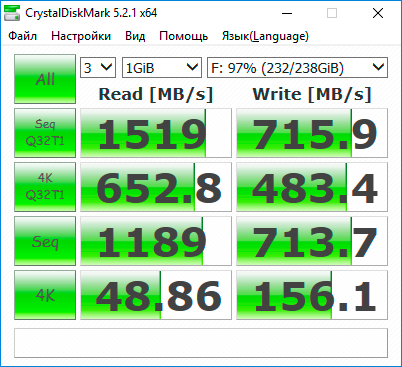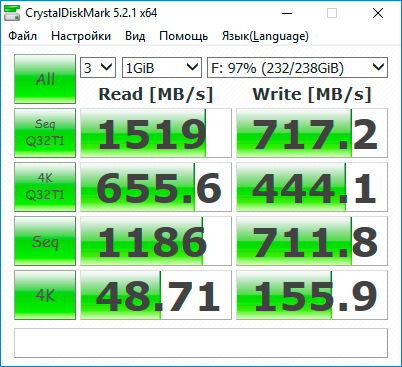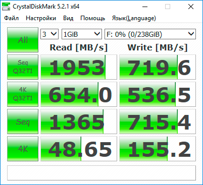 Аналогичная ситуация повторилась и в ATTO Disk Benchmark. Отрыв от «классических» SSD WD Blue PC SSD и WD Green PC SSD достигает 348%, что в полной мере демонстрирует разницу в пропускной способности между интерфейсами подключения SATA 6 Гбит/с и PCIe Gen3 x4.