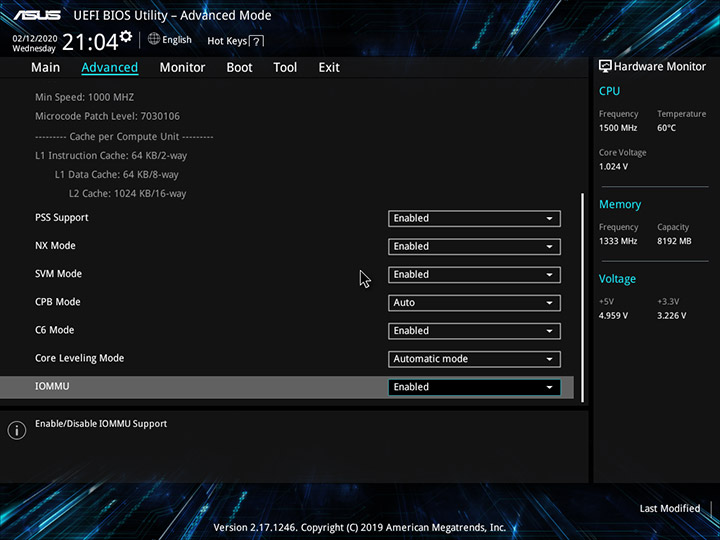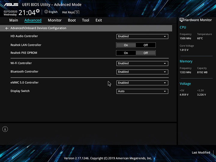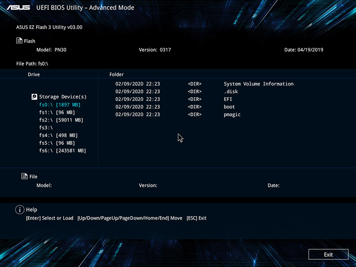 Прошивка Mini PC PN30 базируется на микрокоде UEFI, оснащенном удобным пользовательским интерфейсом, привычным для многих материнских плат ASUS. На вкладке Main выводится информация о версии прошивки, модели CPU и объеме ОЗУ, задаются дата и время, а в правой части окна отображаются показания системного мониторинга.