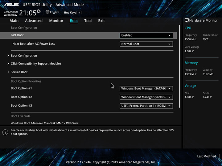 Управление вентилятором и вывод показаний системного мониторинга находится в подменю Monitor, тогда как настройки, связанные с процессом загрузки распложены на вкладке Boot.