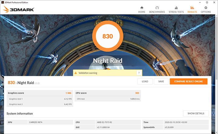 К сожалению, даже использование сравнительного мощного графического ядра не позволило устройству показать приличных результатов в полусинтетическом тестов пакете 3DMark, и виной тому, скорее всего, невысокая производительность процессорных ядер. С таким уровнем быстродействия рассчитывать на комфортные показатели fps в современных видеоиграх не приходится даже с минимальными настройками и в разрешении 720р, так что удел Mini PC PN30 — «казуальные» игры или несложные проекты 10-летней давности.