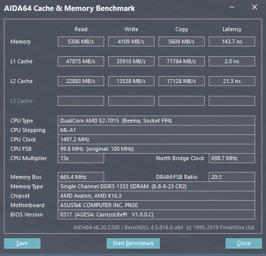 В качестве основы ASUS Mini PC PN30 использует загадочный чип AMD E2-7015. А «загадочный» он потому, что информация о нем отсутствует даже на сайте производителя, от того нам пришлось обратиться к диагностическим утилитам, таким как AIDA64. С ее помощью выяснили, что наш загадочный E2-7015 на самом деле является «системой-на-чипе» семейства Beema, пришедшему на смену экономичным APU Kabini родом из далекого 2013 году. В итоге, наши надежды увидеть внутри Mini PC PN30 чип с новейшей архитектурой Ryzen на этот раз не оправдались. Тем не менее, E2-7015 несмотря на свой почтенный возраст не безнадежен, он произведен с применением 28-нм норм технологического процесса, в его состав входят два процессорных ядрах Puma с поддержкой SIMD SSE4.1, AVX и аппаратного ускорения AES, а также кэш-память второго уровня объемом 1 Мбайт. Отличительной особенностью SoC Beema является наличие аппаратного модуля обеспечения безопасности TrustZone. Процессорная часть работает на 1500 МГц, а при отсутствии нагрузки частота уменьшается до 1000 МГц.
