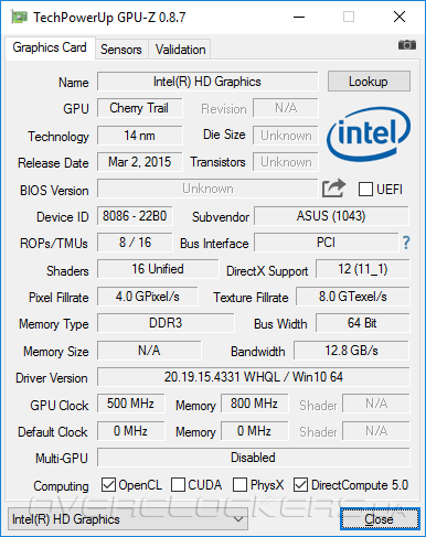 По части видеоподсистемы SoC Intel Atom x5-Z8350 совершенно идентична Atom x5-Z8300: в обоих используется графическое ядро HD Graphics, состоящее из 12 исполнительных устройств, которые в зависимости от выполняемых задач могут работать на частотах от 200 до 500 МГц включительно. Поддерживается API DirectX 12 и OpenCL, а блок аппаратной обработки ускоряет воспроизведение видеопотоков в форматах VC-1, H.264 и HEVC. На практике это означает отсутствие проблем при проигрывании роликов в разрешении 4К при частоте смены кадров до 30 fps, но для комфортного просмотра более тяжелых видеоматериалов мощности графической подсистемы уже может не хватить.