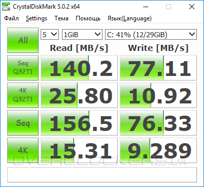 Дисковая подсистема ASUS VivoStick PC представлена SSD Hynix HBG4e объемом всего 32 ГБ, и, так как микрокомпьютер лишен слота microSDXC, то расширить дисковое пространство за счет установки карт памяти не удастся. Твердотельный накопитель подключен к однокристальной системе по интерфейсу eMMC и, увы, не может похвастаться выдающимися скоростными характеристиками. Впрочем, если сравнивать быстродействие новичка со скоростными показателями подсистемы хранения данных того же Intel Compute Stick 2016, то отличия видны только в синтетических бенчмарках.