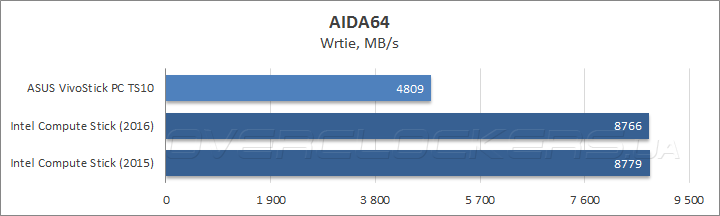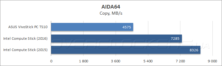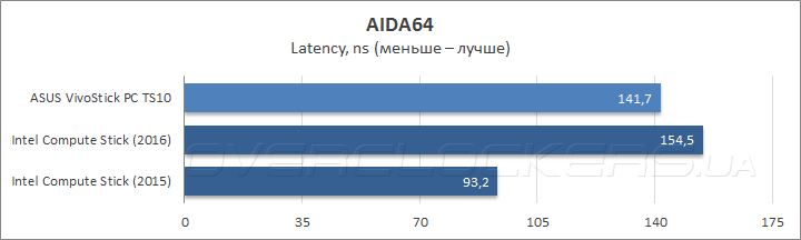 Результаты оценки быстродействия подсистемы оперативной памяти оказались неутешительными для ASUS VivoStick PC: во всех подтестах, за исключением измерения латентности, он заметно отстал от своего прямого конкурента Compute Stick 2016, а самые высокие показатели скорости работы ОЗУ, как ни странно, продемонстрировал микрокомпьютер Intel прошлого поколения. Очевидно, новичка подвела прошивка версии 0306 от 26.02.2016, которая установила завышенные тайминги CL12-15-20-34-1Т взамен типичных для данного режима работы CL11-11-11-28-1Т.