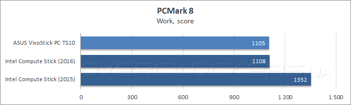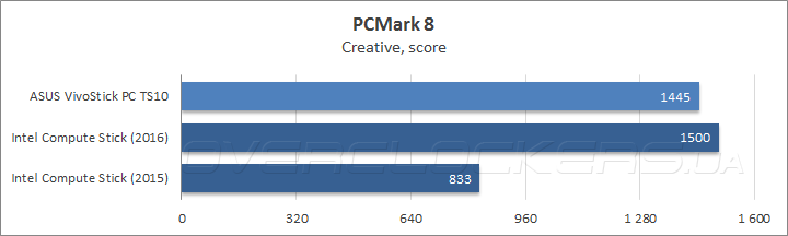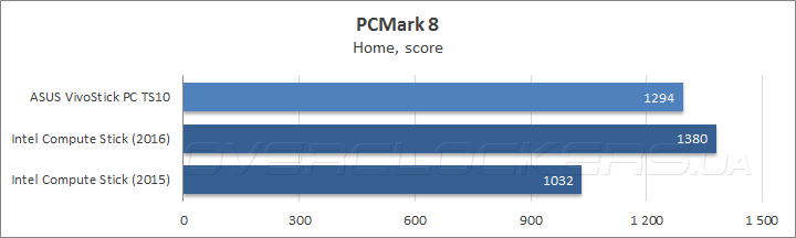 Судя по результатам в бенчмарке Futuremark PCMark 8, предназначенном для комплексной оценки быстродействия в повседневных пользовательских задачах, прирост частоты в режиме Turbo Boost у VivoStick PC TS10 был нивелирован меньшей пропускной способностью подсистемы оперативной памяти, в результат чего в подтестах Home и Creative герой сегодняшнего обзора несколько уступил новому Intel Compute Stick, тогда как в тестовом сценарии Work результаты обоих микрокомпьютеров равны, но оба они заметно проиграли Compute Stick 2015 модельного года из-за некорректной работы LiberOffice, входящего в этот подтест.
