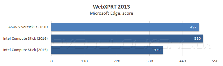 Производительность при работе с веб-сервисами измерялась с помощью онлайн-бенчмарка WebXPRT 2013, для запуска которого использовался штатный браузер Windows 10 — Microsoft Edge. Судя по баллам ASUS VivoStick PC не должен испытывать проблем в подобного рода задачах, во всяком случае, скорость его работы не должна быть меньше, чем у аналогичных устройств.