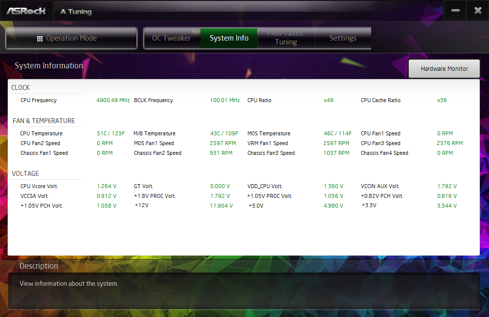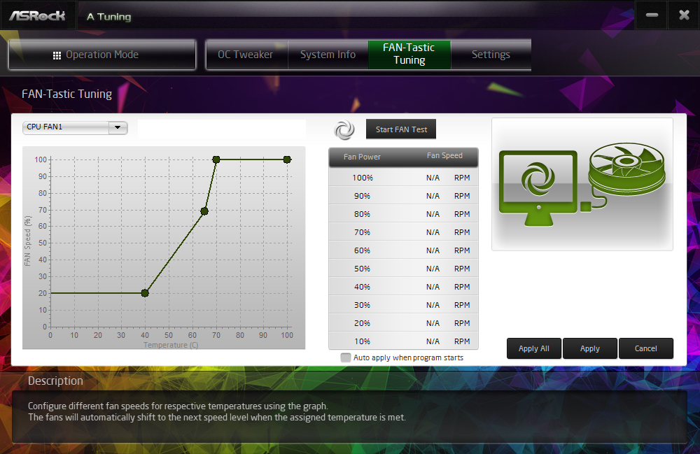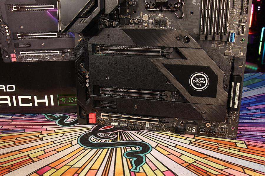Надпись Razer Edition и слоган «For Gamers, By Gamers» находятся на самом заметном месте. Подсветка Chroma есть не только там, но и на панели между слотами PCI-Express — к сожалению, их как раз закрывает видеокарта, как ее не размещай. Вдоль длинной стороны платы с торца присутствует также полоска подсветки, которая создаёт интересный эффект в корпусе. Даже с обратной стороны есть надписи «For Gamers, By Gamers» и жаль, что их никто не увидит после сборки… Даже фирменное приложение A Tuning имеет скин с темой Razer.