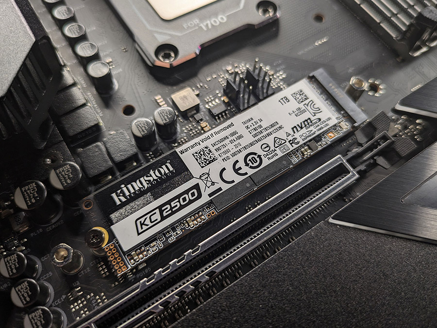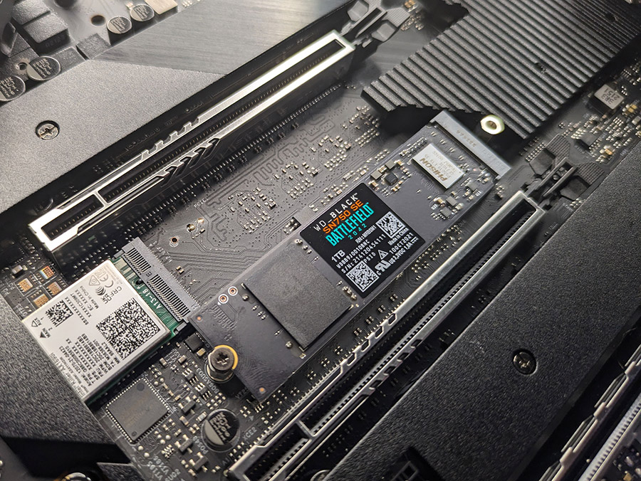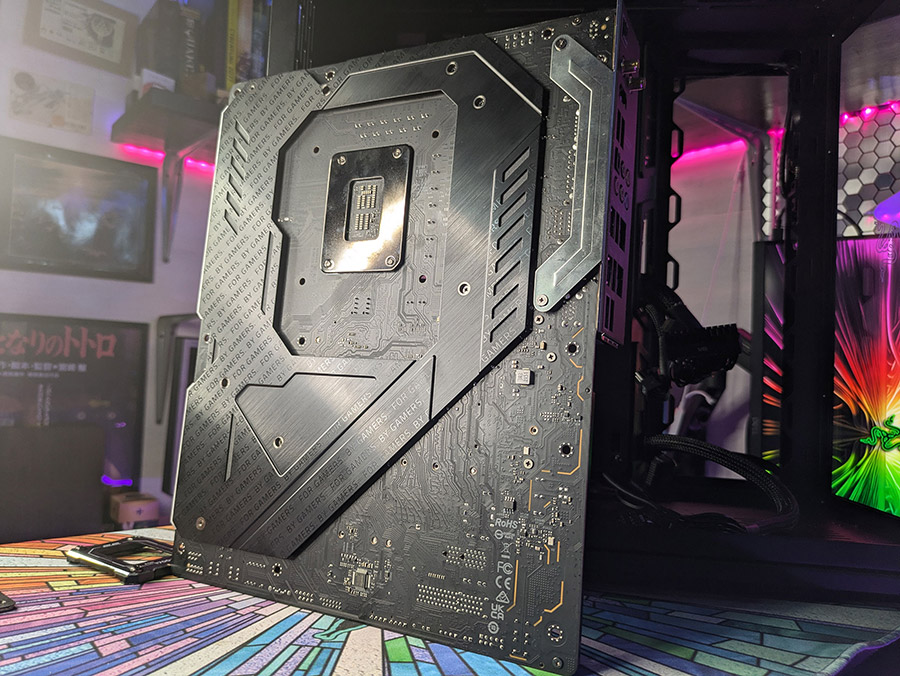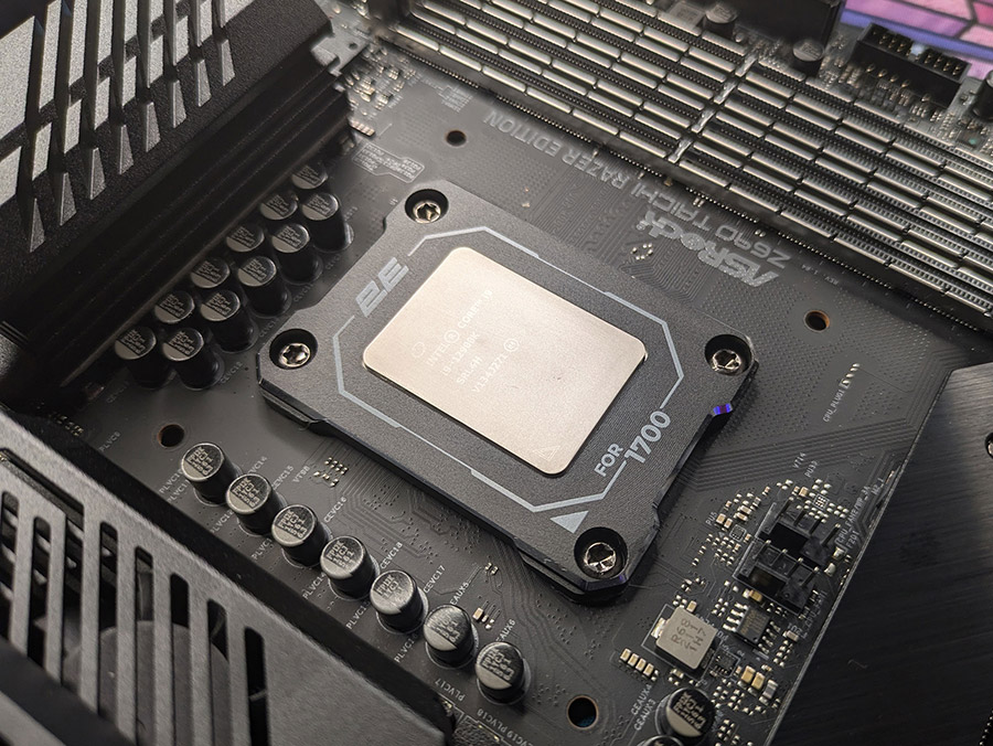 Первой пошла материнская плата ASRock Z690 Taichi Razer Edition с установленным процессором Intel Core i9-12900K. Вместо обычной рамки сокета LGA1700 используется более стационарное решение от 2E Gaming. Естественно, оба SSD-накопителя уже находятся на своих местах под штатными радиаторами. И осталось еще место для третьего, как только на это появится вдохновение — объема с современными играми много не бывает, к тому же удобно инсталлировать игры на тестовые устройства из локальной сети, а не издеваться над Starlink каждый раз, когда надо загрузить тот самый Cyberpunk 2077…