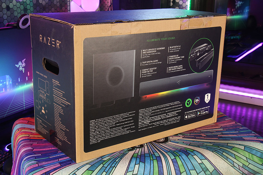 Коробка оказалась больше, чем ожидалось. Или наоборот, устройство меньше, чем ожидалось. Ведь размер саундбара по ширине несколько больше полноразмерной клавиатуры. Сабвуфер по габаритам напоминает маленький Ecoflow. Между ними есть собственное соединение, при этом питание подводится к саундбару, а не к сабвуферу. К ПК подключение осуществляется через USB. Одновременно, можно подсоединить какое-то мобильное устройство благодаря Bluetooth 5.2. В комплекте два набора ножек, чтобы направить звук под нужным углом в разных конфигурациях. Управление незамысловато происходит пятью кнопками сверху: источник, Bluetooth, включение, +/- громкость. Что совсем разочаровало, так это подсветка. Она есть, естественно работает с Razer Chroma, но на темной поверхности стола (точнее, ковриков на нем) не очень заметна даже ночью. Пожалуй, на белом столе было бы намного лучше…