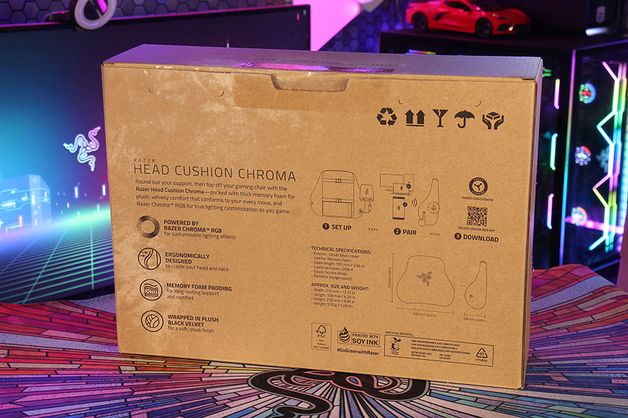 Отдельная история — про подголовник Razer Head Cushion Chroma. Сама по себе идея подушки (больше для шеи, чем для головы) замечательная и в исполнении Razer тоже работает хорошо. Она адекватной жесткости, с приятным покрытием из черного бархата. Только лучше брать обычную версию, без подсветки Chroma. Потому что даже производитель предлагает подать питание на ее очень неуклюжим образом: положить внутрь подушки в специальный карман павербанк и подключить его к USB-порту. Управление настройками (выбор режима подсветки) происходит не обычным образом через Synapse, а со смартфона отдельным приложением. При этом ничего фантастического в самой подсветке нет, обычное лого Razer со змеями, светится не очень ярко и может менять единственный цвет по палитре RGB. Хорошо, что купить этот продукт можно только с собственного сайта Razer.com, дистрибьюторам он не доступен, так что для получения Chroma-версии оголовья в Украине надо заморочиться.