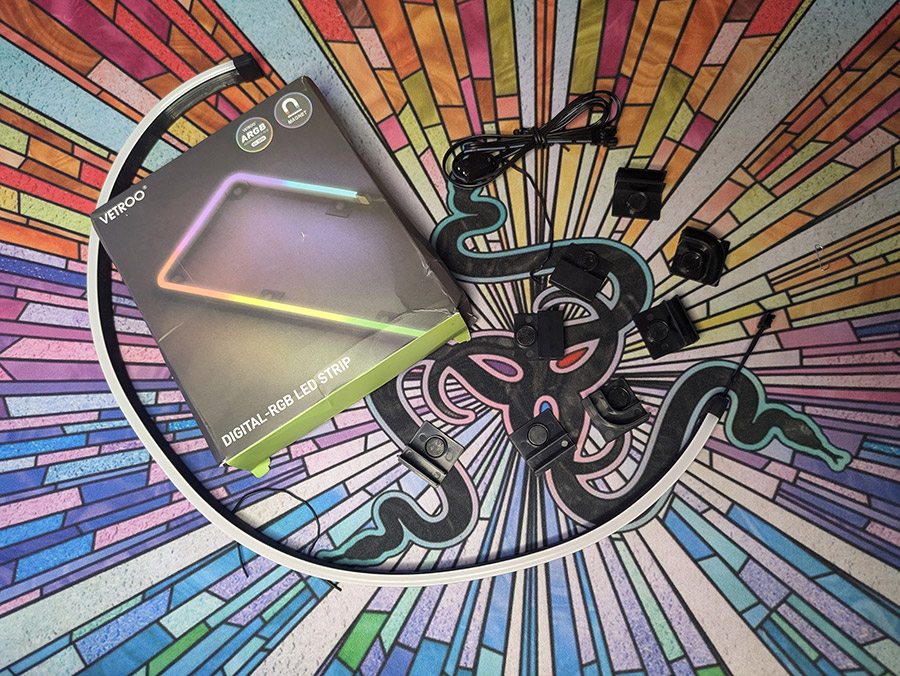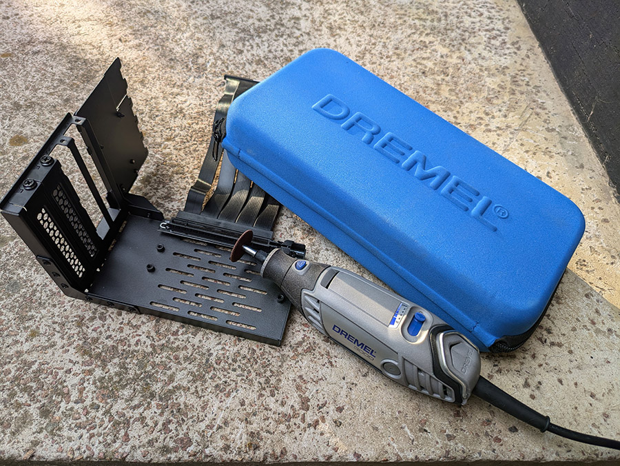 Так, там появился дополнительный 8,8-дюймовый экран с HDMI-подключением, а вдоль задней панели по периметру пошла RGB LED-лента от Vetroo. Для этого вертикальное крепление GPU пришлось познакомить с дремелем и оттянуть от него кусок конструкции: