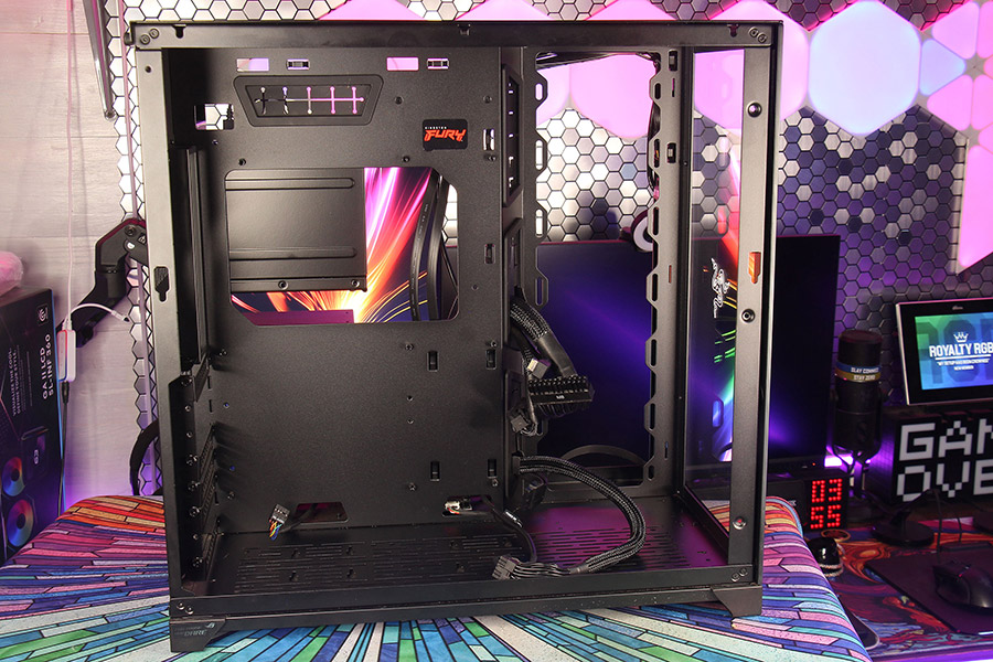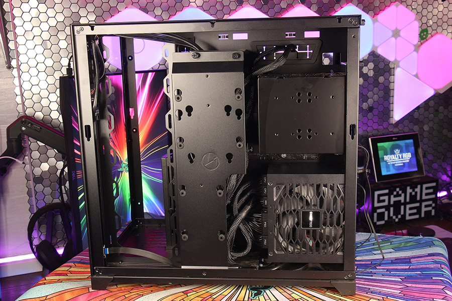 Тогда в 2017 году инженерам Lian-Li удалось создать вторую легенду: PC-O11 (или просто «O11» и да, это буква «о», а не цифра «0»). Это мидл-тауэр, который вертикально разделен на два отсека: один «парадный» для основных компонентов и «задний двор» для блоков питания, SATA-накопителей и других неприглядных деталей ПК. Кроме отделки передней панели, алюминия в конструкции нет, только сталь.