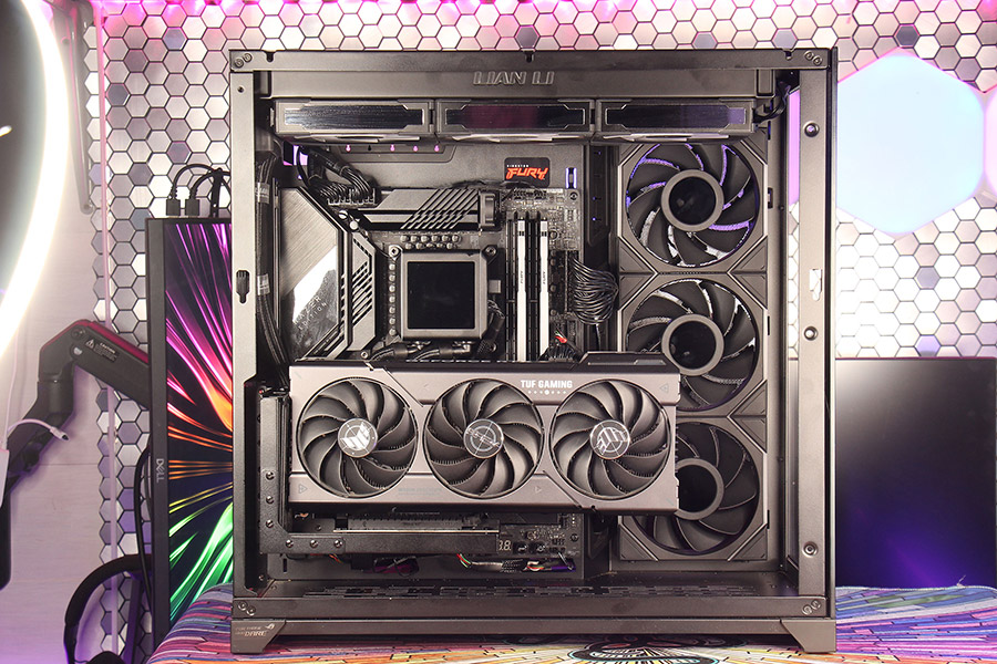 Далее свое место заняла память Kingston Fury KF560C40BBAK2-32 стандарта DDR5-6000 и общим объемом 32 ГБ. Продукт ASRock еще не имеет удобных «односторонних» зажимов для модулей DIMM, поэтому ставить память до появления там видеокарты было критично. В то же время добавились вентиляторы Lian-Li TL LCD Reverse на вдув — естественно, соединенные каскадным образом. Также началась борьба за минимальную заметность проводов питания ATX и всех остальных, выходящих на эту сторону конструкции корпуса O11. Но здесь удалось без фанатизма. С одной стороны, существуют кабели с подсветкой типа Lian-Li Strimer — они решат эту проблему радикально, подчеркивая наличие кабелей, вот только такой эффект не хотелось. С другой стороны, после сборок MSI Project Zero и ASUS Advanced BTF было понимание, что как кабель-менеджмент не делай, будущее аккуратного подключения всё же за полноценно новым стандартом материнских плат.
