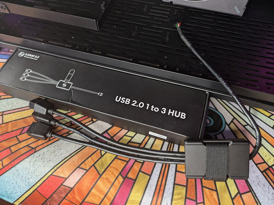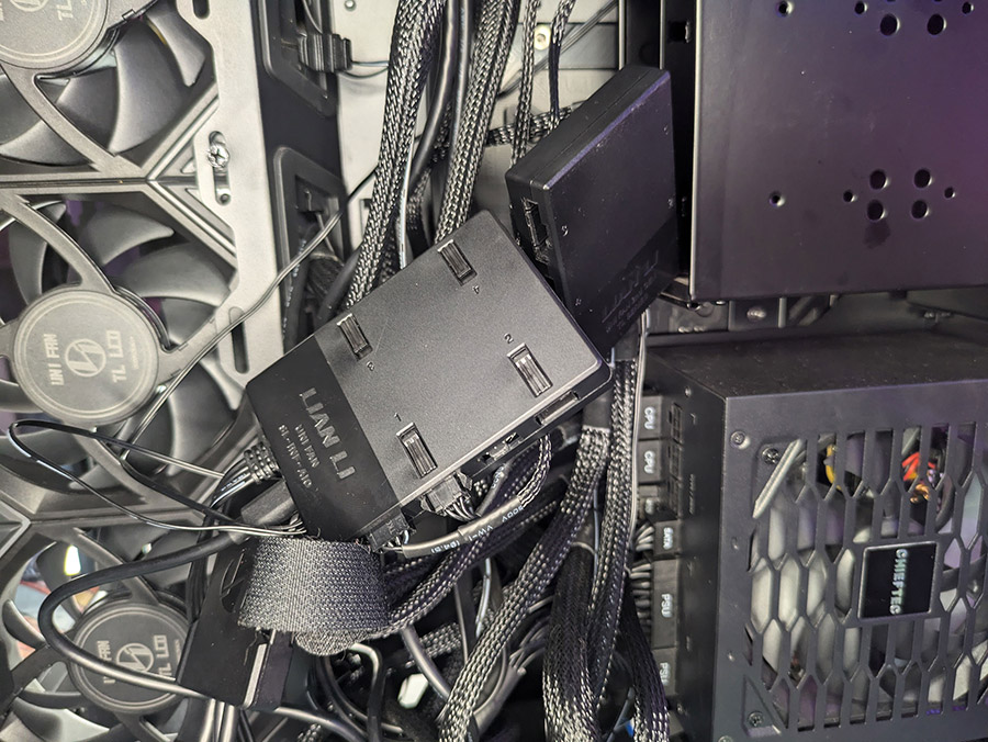 Без «приколов» не обошлось. У Lian-Li строгие требования по подключению контроллеров к USB-портам материнской платы, а у ASRock Z690 Taichi Razer Edition их оказалось недостаточно. Пришлось докупать отдельно еще фирменный хаб и прятать это все с обратной стороны: