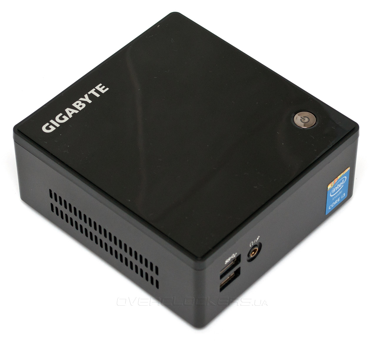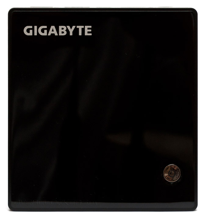 Миниатюрный ПК GB-BXi3H-5010 имеет столь малые габариты, которые составляют всего 114,4x107,6x46,8 мм, что занимаемый им полезный объем не превышает 0,58 л. К слову, буква «s» в наименовании модели означает поддержку устройством дисковых накопителей формата SATA 2,5″, но производителем также предлагаются модификации без возможности установки «ноутбучных» винчестеров, в этом случае их высота уменьшается до 34 мм. Корпус BRIX s выполнен из алюминиевого сплава, тем не менее, его масса не превышает 500 г. Сверху устройство накрыто крышкой из глянцевого пластика черного цвета, которая как магнитом собирает пыль и отпечатки пальцев. В правом нижнем углу находится кнопка включения, во время работы светящаяся изнутри неярким голубым светом.