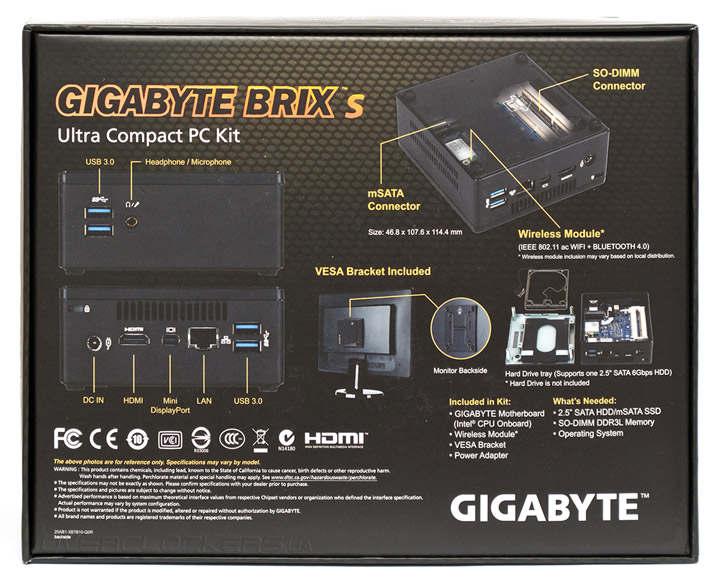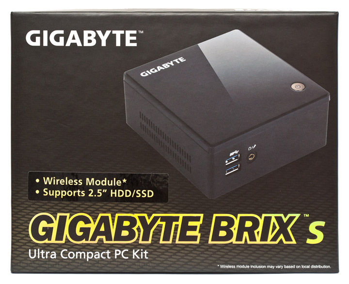 Устройство поставляется в небольшой картонной коробке, содержимое которой надежно уложено в форму из вспененного полистирола, что резко снижает риск его повреждения во время транспортировки. Фронтальную поверхность упаковки украшает изображение GB-BXi3H-5010, здесь же наклеен стикер, означающий наличие в поставке продукта модуля беспроводных сетей и поддержку дисковых накопители формата 2,5″. Последний факт существенно расширяет сферу применения Gigabyte BRIX s за счет возможности хранения больших объемов данных.